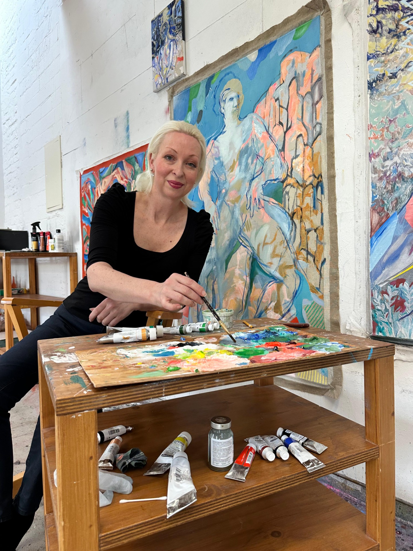 When she arrived in her gigantic 140 square meter studio, she hung the paintings on the 8-meter-high studio wall and looked at them. And then the work began immediately.
