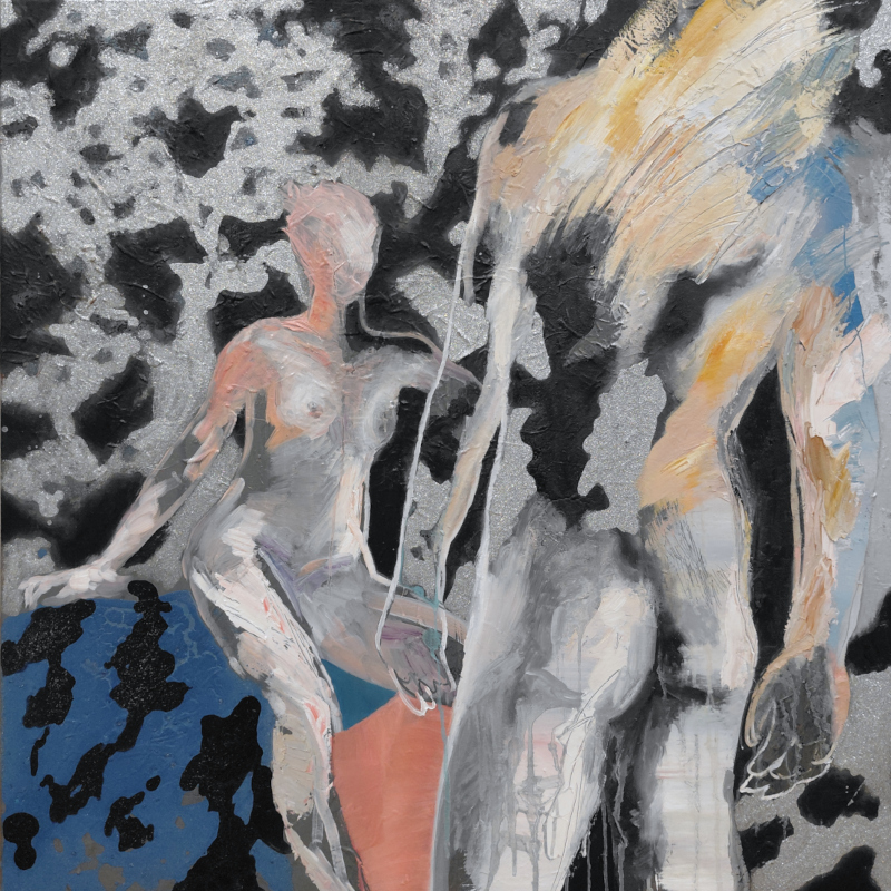 Seduction, 2023-2025, oil, acrylic, and glitter on cardboard, 130 x 120 cm.